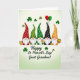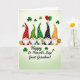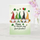 Det här kortet visar fem St. Patrick's Day-tomtar som står sida vid sida i mitten, med runda kroppar och långa vita skägg som ger dem ett mysigt och sällskapligt utseende 💚. Till vänster höjer en tomte i en röd prickig hatt en gyllene mugg, som om han skålar med de andra, medan två tomtar med gröna hattar bredvid honom bär virvlande mönster som ekar av shamrocken runt omkring dem ☘️. Nära höger sida håller en tomte i en svart hatt röda och gröna ballonger som flyter uppåt som en liten parad, och den sista tomten bär en hatt med orangea ränder medan han presenterar en blank gryta med guld. Deras hattar och rekvisita framträder tydligt mot en ljusgrön gradientbakgrund, med mjuk skuggning som får figurerna att se ut att vara försiktigt rundade och nära varandra, som vänner som lutar sig in för att ta en bild. Små shamrockar i olika gröna nyanser är utspridda runt kön, och fyller utrymmet utan att tränga figurerna. Meddelandet “Happy St. Patrick's Day! Great Grandma!” står i mörkgrön bokstav, placerad ovanför och lite