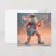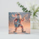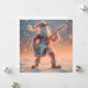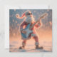 Ett roligt, fantasifullt och mycket detaljerat fotografi eller 3D-rendering med en stiliserad, luddig figur av jultomten iklädd sin traditionella röda och vita dräkt. Tomten bär mörka solglasögon och gör en dramatisk rock-and-roll-pose medan han entusiastiskt spelar en ljusblå och vit elgitarr. Scenen är utomhus i en kraftig snöstorm, med stora, mjuka snöflingor som faller runt honom. Bakgrunden är suddig med ett varmt, gyllene-orange ljus som strålar från horisonten.