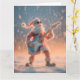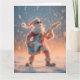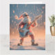 Ett roligt, fantasifullt och mycket detaljerat fotografi eller 3D-rendering med en stiliserad, luddig figur av jultomten iklädd sin traditionella röda och vita dräkt. Tomten bär mörka solglasögon och gör en dramatisk rock-and-roll-pose medan han entusiastiskt spelar en ljusblå och vit elgitarr. Scenen är utomhus i en kraftig snöstorm, med stora, mjuka snöflingor som faller runt honom. Bakgrunden är suddig med ett varmt, gyllene-orange ljus som strålar från horisonten.