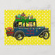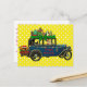 Tomten rider i vintage bil med tre svarta katter. Överdelen av bilen är lastad med gåvor för leverans och lasten hålls i ställe med ett stort band och en stor grönt. Det finns en katt i baksätet som bär en gingham-bukslips och två katter som bär julhattar åker bakifrån på en bärare. Bilen dekoreras med helgdag ljus och "Glad helg" visas på billuckan. Skämmande gult och vitt polka dots ger bakgrunden till den här söta scenen. Kortets baksida, som är anpassadet, lyder: "Må dina helgdagar gnistra med stunder av kärlek, skratt och välvilja, och kan året före bli fullt av nöje och tillfredsställelse". Det finns också en mall för ditt namn.
