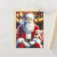 Personlig julkort. En söt vattenfärgskonst i stil ai som skildrar tomten med en valp hund på hans höft på julen Kväll med vintage vibes. Vintagens pappra bakgrund med snöflingor.