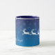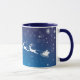 Den här marinblå kamouten mugg har en julmatad bild - en vit silhuett av Jultomten och renar som drar en ludd på en snövintvätt och "Glad helg!" text i det nedre lämnat hörnet i kalligrafi. Anpassa den med egen text eller namn.