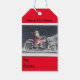 Tomten kör en motorcykel genom en mjuk, nedfallande jul kväll snö. Önska motorcykeln älskare om God jul med denna färgstarka märkre.