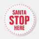 Tomten stannar här, röd och vit, söt, rolig magnet Juldekorationer omgiven av en känslig rund andedräkt av söt snöflingor