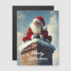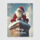Bilden visar Tomten sittande på toppen av en snötäckt tegelskorsten, iklädd sin ikoniska röda dräkt med vit päls och en röd hatt. Han ler varmt, hans handskar ihopklämda, medan snön försiktigt faller runt honom. Bakgrunden visar en mjuk, vinters himmel med lätta moln, som förstärker den festliga och magiska atmosfären i scenen.