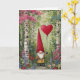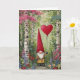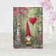 Tomtevalentin-kort-Tom blank insida-Anpassningsbar. Tomte som håller en röd hjärtsballong i skogen.