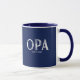 Opa-kaffet mugg med ett etablerat år med ett vitt stampat teckensnitt på en marin blå bakgrund. Klicka på Anpassa om du vill redigera bakgrunden färg!. Besök vår butik för att se det här mugg i ett stort sortiment av farfar namn.