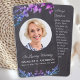 Rustic Chalkboard Eucalyptus Sympathy Funeral Prayer Cards. Det här eleganterna minneskortet för böner har en blå lila rosa eucalyptus grey på chalkboard skiate design. "In Loving Memory" Anpassa det här minneskortet för begravning med dina nära foto, namn & data och känslor. Tillbaka ~ 'May you Always Walk in Sunshine' Dikt, som kan vara personlig, var snäll och nå ut om du vill ha en design med en särskild dikt annan än. Det här minneskortet kommer att vara en välkänd keepé, för begravningstjänster och firande i livet. COPYRIGHT © 2020 Judy Burrows, Black Hund Art - Med alla Höger reserverade. Rustiskt foliage-minoriskt fotoportskort