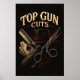 Vintage gangster-style barbershop emblem featuring crossed razor and scissors over a fedora hat, ace of spades cards, and bold "Top Gun Cuts" lettering on a dark background. This edgy logo design is perfect for barber shop posters, wall frames, and prints on Zazzle, capturing urban swagger and classic style.