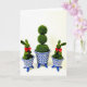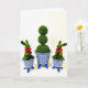 This card shows three decorative pieces arranged on a bright white background, with a tidy, airy look and a gentle touch of romance in the way the side figures seem to face inward. In the middle sits a tiered green topiary shaped into stacked rounded forms, planted in an ornate ceramic pot. The pot features a cobalt blue and white lattice pattern and stands on three small blue feet, giving it a refined, classic feel. On either side are two plush, bunny-like forest creatures 🐰 with long upright ears and simple faces, posed as if keeping the topiary company. Their soft green, mossy texture is accented by shiny red bows at their necks, like little gifts shared between close friends 🌷. Each of these figures sits in its own smaller matching blue-and-white patterned pot with the same three-foot base, creating a balanced, symmetrical layout. There is no text, leaving the white space open around the trio while the cool blues, fresh greens, and red bows stand out under bright, even lighting.