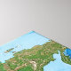 Denna detaljerade världskartillustration har en realistisk topografisk färgsättning som framhäver jordens naturliga terräng och höjd. Kontinenterna återges i rika gröna, bruna och sandfärger för att återspegla vegetation, berg och öknar, medan djupa och grunda havsblå toner tillför djup och kontrast. Designen erbjuder en ren, informativ och visuellt slående representation av planeten, idealisk för de som älskar geografi, lärare och de som är intresserade av geovetenskap.