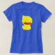 En glad och leende gult gummi, en dyster, blå t-shirt.