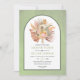 Sage grönt Arch bröllopsinbjudan med torkade handflatan löv, pampas gräs och proteablommor. En båge ram finns på en grönt med nedfläckad i den här fantastiska bröllop-utformningen. En bukett av botaniskt torkat handflatan löv, proteablommor och pampasgräs visas i ram.