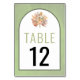 Tropiskt torkat handflatan löv, pampasgräs och proteablommor sage grönt arch bröllop bordsnummer. Den här fina bröllop-designen har ett ram på gröntens nedfläckad. I ram finns en bukett av torkade löv från handflatan, proteablommor och pampasgräs.