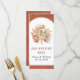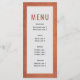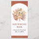 Tropiskt torkat handflatan löv, pampasgräs och proteablommor teracotta arch botanical bröllop menykort. Den här fina bröllop-designen har ram på terracotta-nedfläckadens bakgrund. I ram finns en bukett av torkade löv från handflatan, proteablommor och pampasgräs.