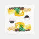 En roligt och öga-illustration av den ljusa gulten ost hjul och ostbitar i en buffet stil som har dekadenta chokladtryffel, druvklasar och ett glas rött vin runt dem.