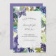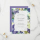 Inbjudan dina gäster till ett vår, informellt eller trädgårdsbröllop med den pappra och lila blommigten med romantiska vibes. Blommor är lila och purpblått med grönt. Det finns lite lila glitter och en lila fjäril på framsidan.