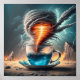 Ett foto av en kopp kaffe där ett tornado kommer ut. Kaffet kopp är vitt med ett svart handtag, och det är sitta på ett bord av trä. Tornadot kommer från toppen av kaffet kopp och består av en virvelande massa kaffe.