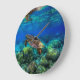 Simma med den tropiska exotiska havssköldpaddan! En brant fotofoto dyving strax under yta i det blå tropiska havet vatten. Se havssköldpaddans simma runt korallreven med liten färggranattropisk fisk i närheten. Havssköldpaddor kan leva upp till 100 år, hålla utandningsluften under vatten i upp till 5 timmar åt gången, äta maneter och väga upp till 2 000 lBS.