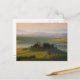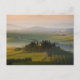 Fotobrevkort över det berömda huset Podere il Belvedere omgivet av kullar och cypresser vid soluppgången på en dimmig morgon i ett landskap i Orcia-dalen i Toscana, Italien.