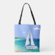 En segelbåt med ditt namn på den närmar sig en strand. Tropiskt havsvy. Blått, teal, havsskum, turkos, grönt, vitt.