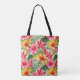 Denna skuldersäck visas med ett flerfärgat handflatan-tryck av tropiska blommigtar. Medelstor storlek visas. Har svarta band. Anpassa det här objektet eller köp som det är. Licensierad utskrift