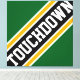 Den här sportfotbollsdesignen har en atletisk TOUCHDOWN-text inuti markerad diagonal svartvit, vit och guldfärgad tävla rand för gult mot bakgrund av grönten i skogen. Det första och sista breven i texten springa på kanten som är utformat med en dynamisk banderoffekt. Färg och text i den här utformningen kan vara personlig.