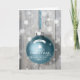 Stilfull affärsjulkort med en skina blåttjulprydnad på en woodenbackgroundstruktur och en fallande snöflingor.