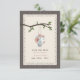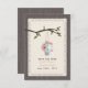 Ett utomhus bröllop spara datum med en illustration av en tenn som kan fyllas med persikor och blå daisy hängande från träd gren med grönt löv. Bakgrunden på framsidan och baksidan är trä inspirerat.