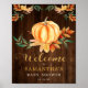 Akvarell liten orange pumpa baby shower välkomstskylt. Med en akvarellpumpa som vilar på en säng av höstfärgade blad och guldglitter "Välkommen"-typsnitt. Anpassa denna söta lilla pumpa välkomstaffisch enkelt och snabbt.