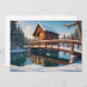 Ett julkort med en trädömd bro över en damm, med snöiga barrträd runt omkring. Designen skapades av Debbie Quick från Debs Creative Images: www.debscreativeimages.com