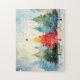 Njut av denna viskartade gult-toppade röda träd i gräs, som är centrerad i en grupp vintage-inspirerat vattenfärgsfärgat Julgranar på ett snöslandskap utomhus. Det skarpa och kontrasterande färg i vattenfärg gör ett roligt och intressant pussel i helgdag som du kan ge till dina vänner och familjemedlemmar vid dina festliga sammankomster.