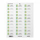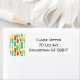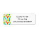 Dessa returetiketter har ett modernt mönster i mitten av århundradet med långa ovaler i gult, orange, grönt och turkos med svart linjer med cirklar i ändarna.