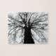 Ett svart och vitt foto av silhuetten från ett gammalt träd med många grenar.