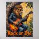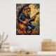 Denna slående målning fångar en stor lejon, försedd med solglasögon och läder jacka, helt nedsänkt i att spela en elektrisk gitarr medan sitta ligger i ett träd-kofferts naturliga omgivning. Den omgivande råbarken och tipsen på grönt löv bidrar till vildens estetik. Konstnärets använda av djärva, texturerade penseldrag understryker den obearbetade kraften och inställningen "Sten eller Die" från detta oväntade kung i sten