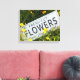Vackra sommarblommor i en trädgårdssäng med en vit skylt som säger friska snittblommor. Nära en fantastisk av blomningsanläggningar i många färg med ett nytt modernt tecken gömt i flodbädden.
