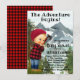 Trädfällare baby shower-inbjudningar med söt baby pojke som bär blå jeans och buffalo-rutig jacka på en rustik akvarell berg och träd bakgrund. Dessa trädfällare baby shower-inbjudningar kan enkelt anpassas för ditt evenemang genom att helt enkelt lägga till dina detaljer.