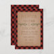 Ett rustikt bröllopsmottagningskort med en illustration av julgröna trädgrenar. Bakgrunden är röd och svart rutarvigt.