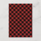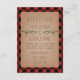 Ett rustikt bröllopsmottagningskort med en illustration av grenar från städsegröna träd. Bakgrunden är röd och svart rutmönster.
