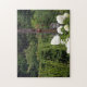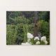 En fridfull scen där vita hortensior blommar mot en frodig grön skog, kompletterad med en gammal väderflöjel. Upplev en tyst vila i en lugn trädgård där det dagliga livets buller tonar bort.