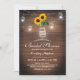 Lantlig bröllopsdusch-inbjudan mall med en rustik bakgrund av lada i trä, era initialer tryckta på jutesnöre runt en masonkruka, slingrande ljus, ljusgula solrosor och en textmall för bröllopsdusch som är lätt att anpassa.