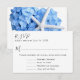 Trädgårdsmeny svarskort vid havet. Bifoga med bröllopsinbjudningar och be gästerna välja en förrätt från meny listan. Inkludera även text för de som inte kommer att delta. Vitt papper med svarta textmallar. Den blå blomdesignen finns på baksidan. En vit sjöstjärna är placerad bland blommorna och ger detta svar en sommar eller strandtema.
