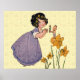 Fira våren med denna underbara bild av en söt liten trädgårdstomte och dess blommor. Från ett vintage vykort från 1919, ursprungligen ett påskkort, visar detta söta lilla kort en vacker ung flicka med mörkt hår, lila klänning och blommor i håret, som tar emot en liten narciss från en liten trädgårdsälva som hon hittar bland narcissblommorna. Den lilla älvan håller upp blomman mot henne. Han står på toppen av en liten narcis när han räcker den lilla blomman till hennes utsträckta händer. Vad en vacker vintage-älva påskpresent till din älskade! Kortet har en vacker gul mönsterbakgrund, som sjunger om vår och nytt liv!