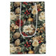 Buoyant pine needles, red and white poinsettias, vibrant pinecones, and bright red berries cover this traditional holiday gift bag.