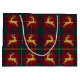 This design features a traditional plaid or tartan pattern composed of deep reds, forest greens, and golden yellow lines, which evoke classic Christmas colors. Superimposed on this festive background is a repeating motif of silhouetted golden deer or reindeer, often depicted in a leaping or running stance. The combination of the warm, wintry plaid and the iconic holiday animal strongly suggests this design is perfect for Christmas wrapping paper or a similar seasonal decor.
