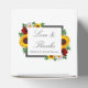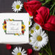Designen har eleganta solrosor, rosor och prästkragar i en gyllene gul, röd och vit höstfärgsättning. Designen har också en ram i kolgrått. Du kan ändra bakgrundsfärgen på framsidan och baksidan till den färg du önskar eller låta båda vara vita.
