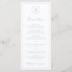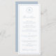 Enkelt dammigt blått bröllop-meny med ditt monogram i en cirkel överst och menyalternativen omges av ett tunt gräns. Huvudet och namnen finns i ett handskrivet skript i eleganten. Den klassiska, traditionella layouten gör den här menyn underbar för ett formellt vinterbröllop.