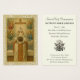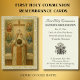 Elegant katolskt första kommunion- minne med en gammal fromhetsbild av höjandet av nattvardsbrödet under den heliga mässan. Prästen, iklädd traditionella romerska mässkrudar, höjer det heliga brödet med monogrammet IHS, omgiven av beundrande änglar och strålande ljus från korset. Denna klassiska och vördnadsfulla design är kombinerad med personliga detaljer om kommunikantens speciella dag, församlingen och celebranten. Ett perfekt minne för denna viktiga sakramentala milstolpe.