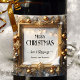 En klassisk juletikett vin med ett guld stiliserat ram med prydnadsföremål, ljus och snö.