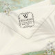 En frimärke-design med traditionell fyrkantig personlig med självinfärgning som har en dekorativ gräns med typografiska dekorationer av elegant, inledande monogram, namn och returadress.